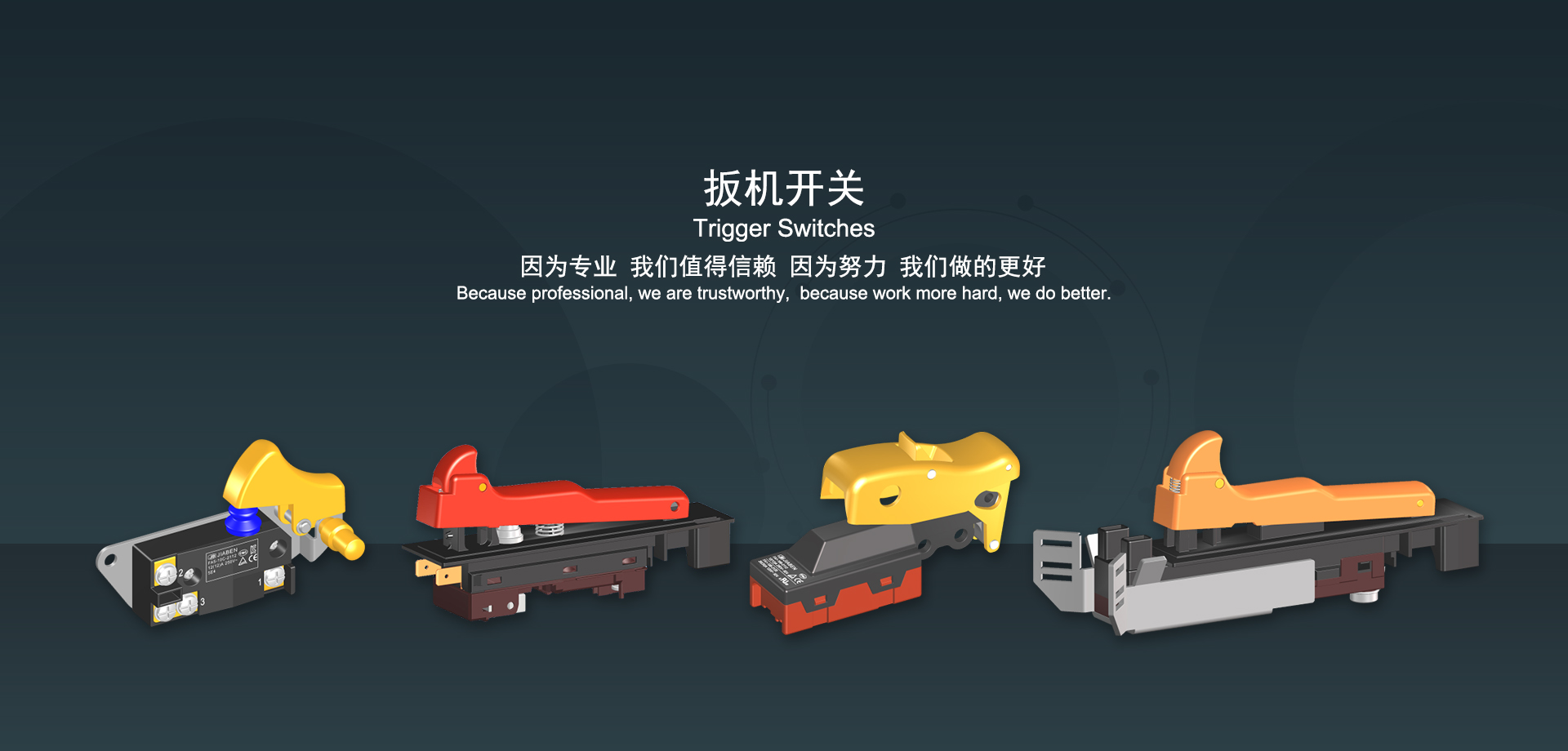 浙江佳奔電子有限公司始建于1986年,坐落于浙江省樂清市虹橋鎮(zhèn)東電子信息產(chǎn)業(yè)園內(nèi),現(xiàn)有職工700多人,資產(chǎn)總額超3億元。公司主要經(jīng)營“JIABEN”牌微動開關(guān)、蹺板開關(guān)、按鈕開關(guān)、扳機(jī)開關(guān)、調(diào)速開關(guān)和電位器開關(guān)等各類交、直流器具開關(guān)和各類交、直流線路板模塊等產(chǎn)品,主要應(yīng)用于交、直流電動工具、電動園林工具、清潔器具、家用電器和小型機(jī)床等行業(yè),是集產(chǎn)品設(shè)計、研發(fā)、制造、銷售和服務(wù)于一體的國家高新技術(shù)企業(yè)。JIABEN was founded in 1986, located in East Electronic Information Industry Park, Hongqiao Town, Yueqing City, Zhejiang Proviance, existing staff more than 700 peoples, more than 300 million RMB worth of assets. Company is mainly engaged in "JIABEN" brand Micro Switch, Rocker Switch, Push-button Switch, Trigger Switch, Speed Regulating Switch, Potentiometer Switch and other kinds of appliance switch and all kinds of AC or DC circuit board module, such as more than 100 series, 8000 kinds of models of products, mainly used in AC or DC Power-tools, Power Gardening Tools, Cleaning Appliances, Household Appliances and Small Machine Tool and other industries, is the collection product design, research and development, manufacturing, sales and service in one of the national high and new technology enterprise.